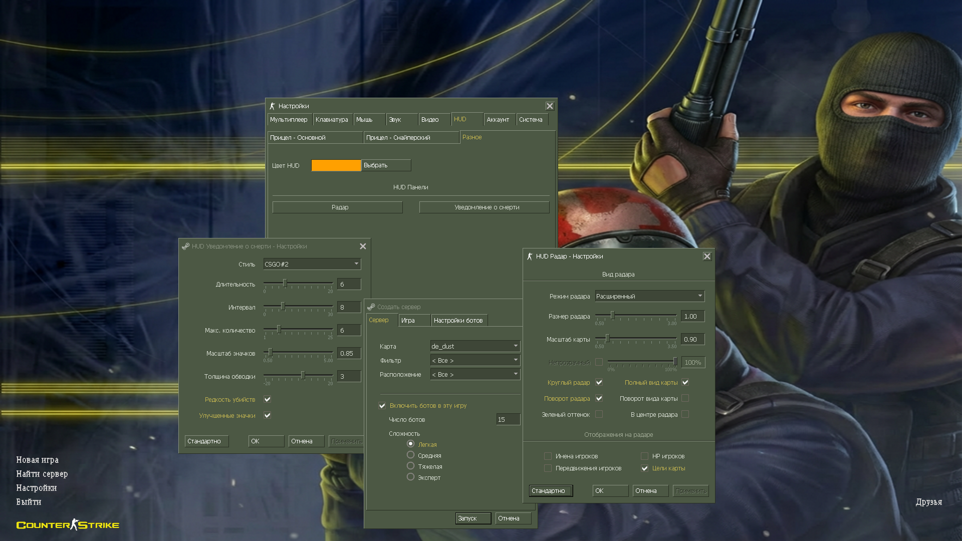 В качестве карт разработчики и авторы модов предлагают вам самые разные места. Вы сможете проверить свое мастерство практически во всех странах мира, CS 1.6 на русском позволяет играть на любых серверах в любой точке нашей планеты. Воюйте в деревнях на востоке, взрывайте порты, спасайте заложников из офисов и выполните свою задачу в сотнях других карт. Карта представляет собой уникальное строение, текстурки и тематику. Каждый геймер сможет найти что-то подходящее и интересное. При необходимости Вы сможете загрузить моды, чтобы разнообразить игровой процесс и по-новому взглянуть на классическую версию шутера.